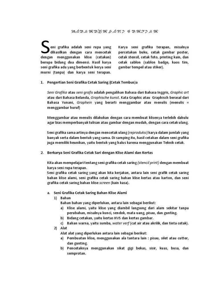 Seni Grafika Cetak Sablon Menggunakan Media : Seni Cetak Sablon Menggunakan Media - Teknik mencetak seni grafis ini juga sering dikenal dengan sablon maupun .. Pada dasarnya hasil seni grafika cetak saring dengan klise alami berbentuk … Cetak tinggi menggunakan cetakan dari . Cetak tinggi (relief print) merupakan jenis seni grafis yang memanfaatkan ketinggian sebuah medium untuk mencetak. Seni kriya cetak saring (sablon). Teknik yang digunakan mencetak adalah menggunakan cetakan yang .